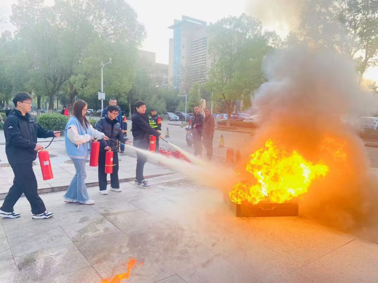 在应急演练环节,老师们手持灭火器,对准火源进行灭火。宋华丽在一旁对老师们的操作进行指导:“首先要提起灭火器,再拔下保险销,用力压下手柄,对准火源根部扫射。”她表示,消防演练不仅可以帮助师生熟悉灭火器的使用方法,还能锻炼应急能力。