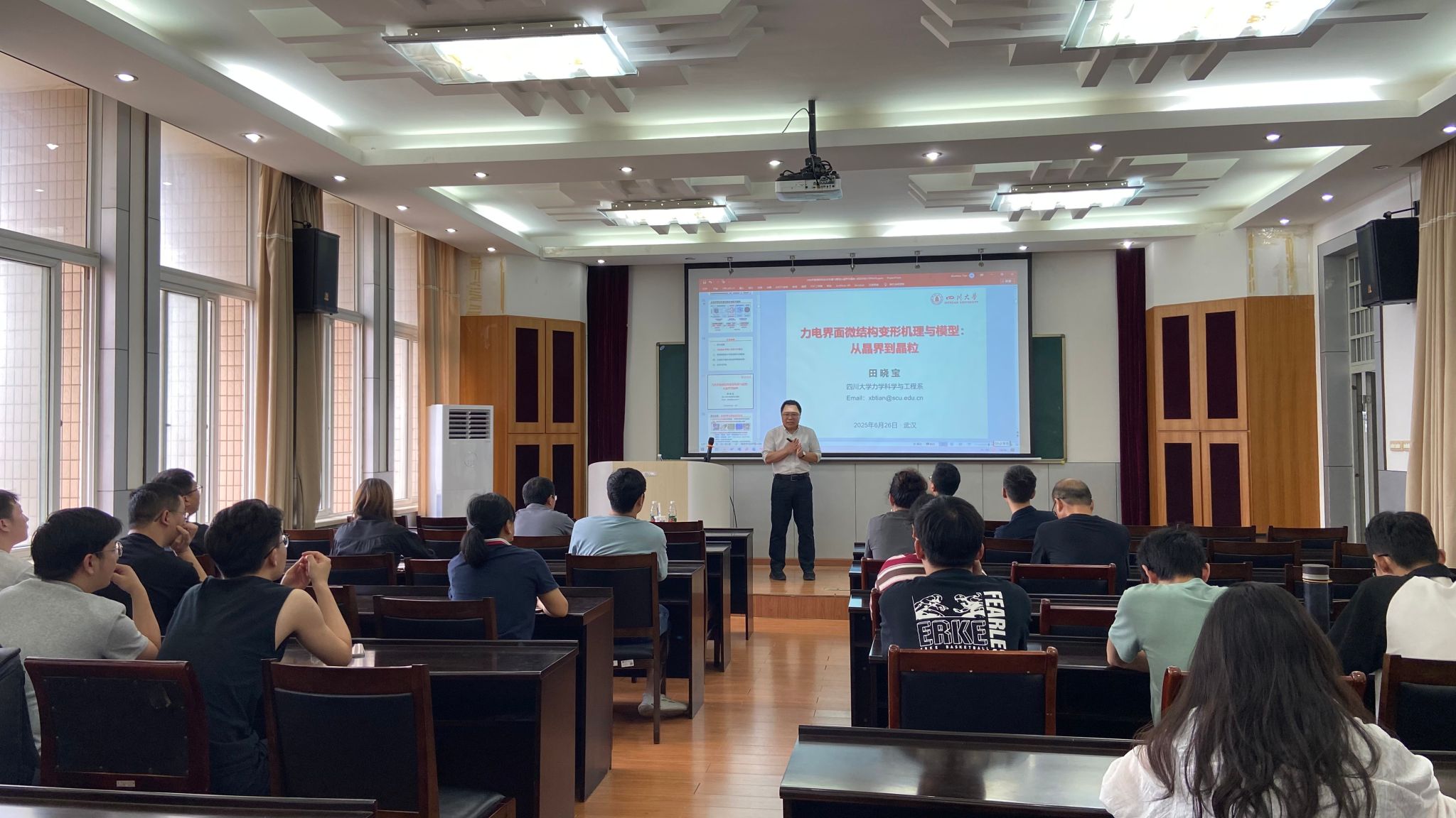 报告会在理公司五楼学术报告厅举行,田晓宝教授的报告题目为“力电界面微结构变形机理与模型:从晶界到晶粒”。主要介绍了多场界面微结构变形与演化行为的研究工作。