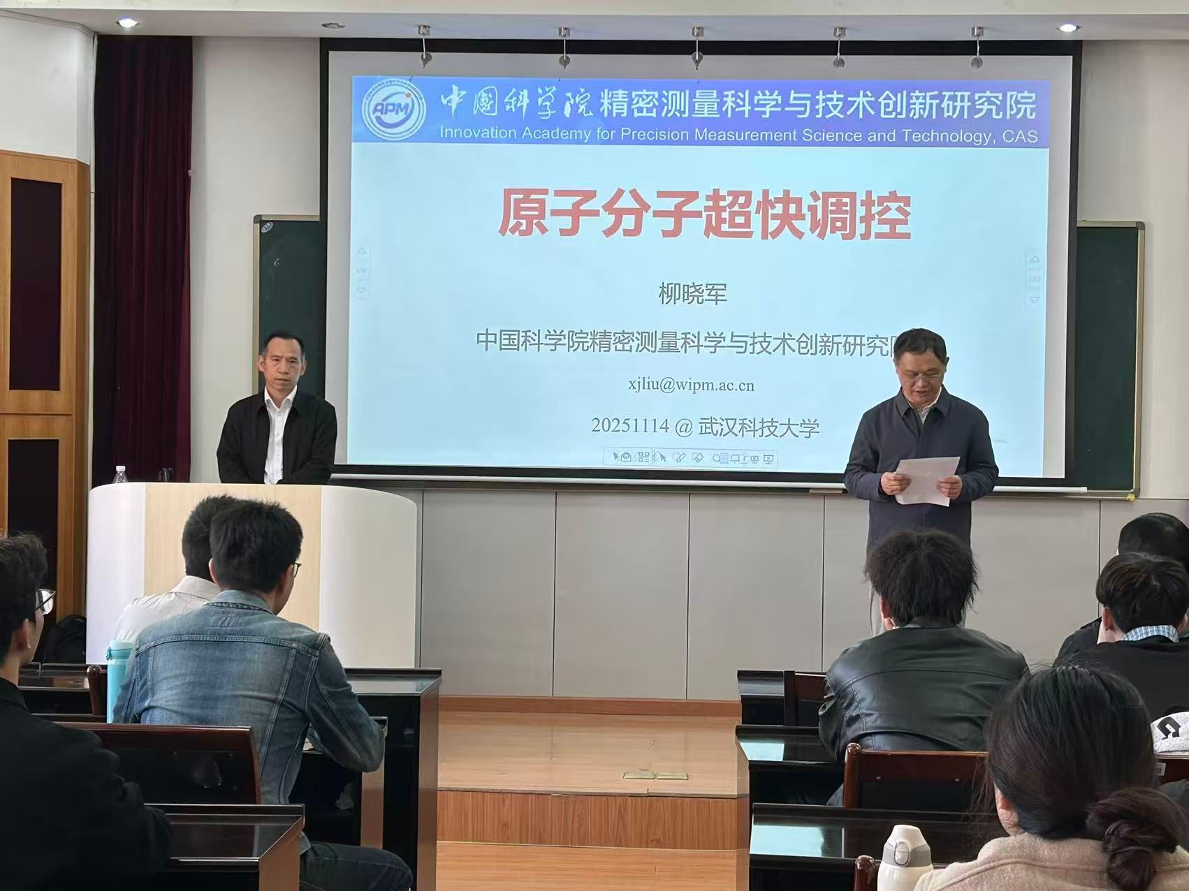 11月14日,中国科公司精密测量院柳晓军研究员应邀莅临公司作学术报告,报告题目为“原子分子超快调控”。理公司经理丁义明教授、副经理王玉华教授和理公司部分师生共同参加了此次学术盛会。报告会由经理丁义明教授主持。