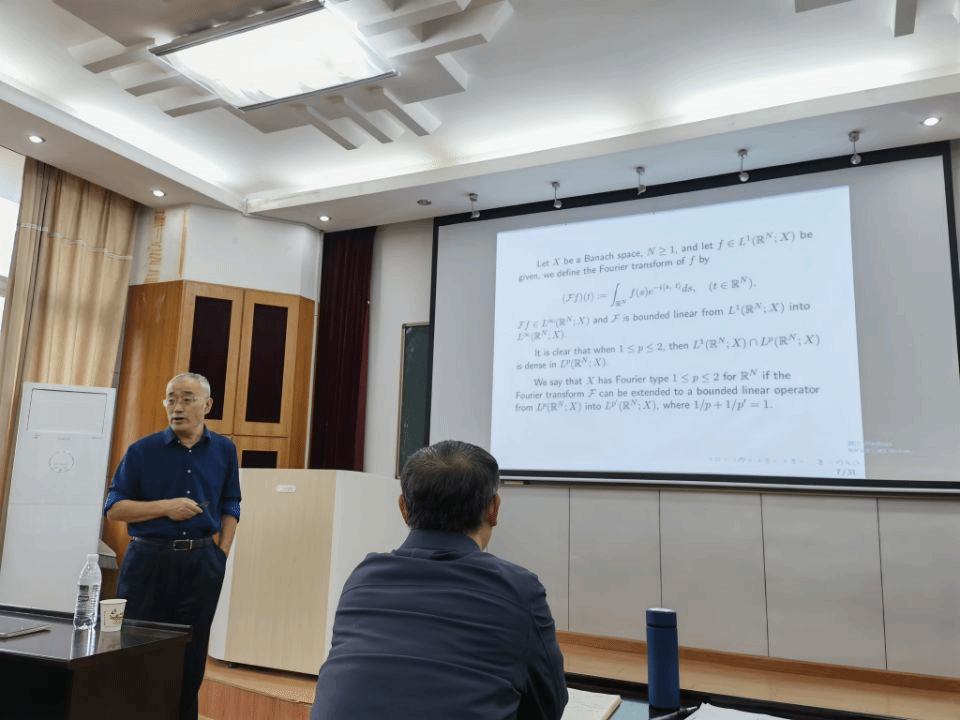 步尚全教授首先作了题为“Types in Banach spaces”的学术报告。他系统介绍了刻画Banach空间几何结构的一系列重要概念,如Rademacher型、Fourier型与Enflo型等,并深入阐述了这些“型”之间的深刻联系与区别。步教授特别展示了如何利用Hölder连续函数的Fourier级数收敛性质,来精确刻画具有非平凡Fourier型的Banach空间。报告内容深邃,逻辑严密,将Banach空间几何、概率论与调和分析巧妙融合,体现了该研究方向的前沿性与交叉性。