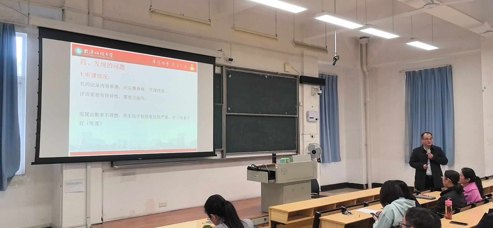 本次会议的汇报内容主要包括日程安排、检查内容、表扬人员、发现问题、整改建议、审核评估工作和最近重要工作。张传洲依次对本次教学检查的相关内容进行了展示,并对教学大纲合订本及课程档案、毕业论文等材料中出现的问题进行了说明。张传洲指出,部分教学大纲有缺少课程目录、字体不一致和缺少执笔人、审核人及日期等问题,在课程档案部分存在试卷批改不规范、试卷分析不到位和实验课程缺少教学日志等不足。