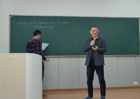 在本次报告中,吕鑫教授介绍了一般型曲面的Albanese 映射。根据Albanese 映射像的维数,提出了两个问题。当像的维数是1时,一般型曲面到其像之间是一个曲面纤维化,这个纤维化的亏格有没有一个上界?当像的维数是2时,一般型曲面到像之间是一个一般覆盖,这个覆盖的次数有没有一个上界?吕鑫教授介绍了他们团队对这两个问题的研究成果,并且讨论了在解决此类难题过程中所遇到的困难。