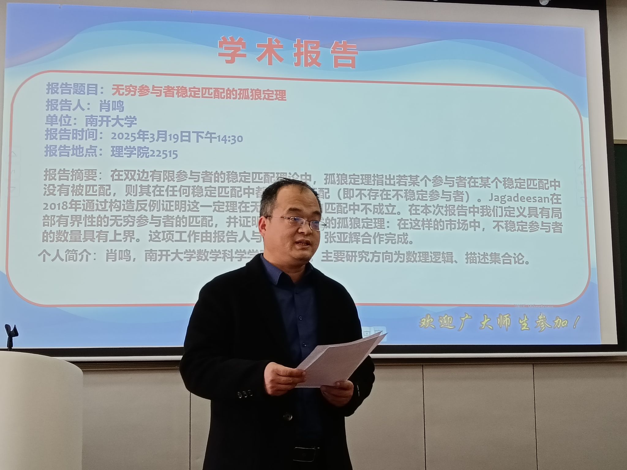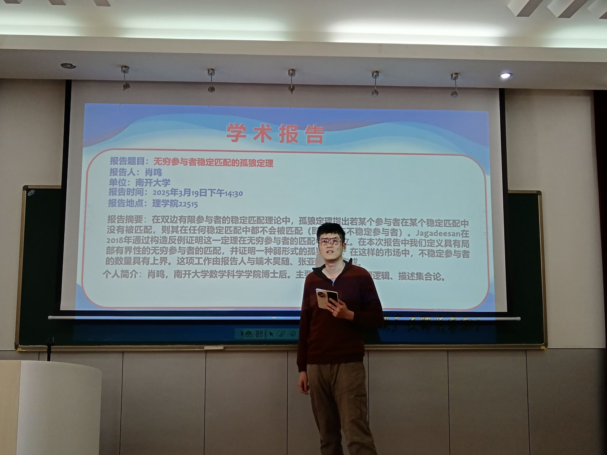 2025年3月19日下午14:30,南开大学博士后肖鸣应邀为公司作了一场题为“无穷参与者稳定匹配的孤狼定理”的学术报告。本次报告会由理公司副经理张传洲教授主持,理公司数学与统计系教师及数学专业研究生员工代表齐聚一堂,认真听取了肖博士的精彩分享。