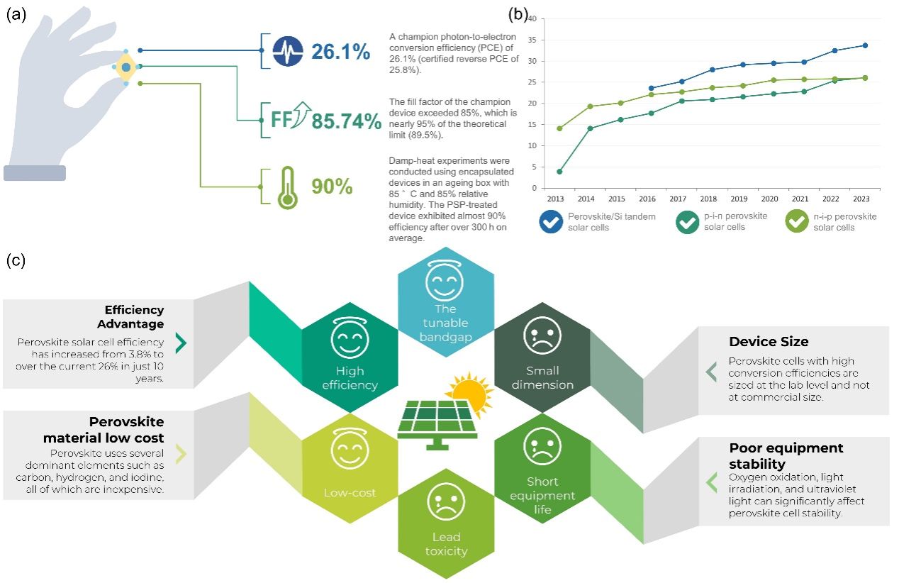 图 1. (a) 迄今记录的最高效率PSC的发展现状。(b) PSC(包括n-i-p PSC、p-i-n PSC 和钙钛矿/硅串联太阳能电池)的PCE随时间的变化。(c) 钙钛矿太阳能电池的竞争优势和劣势示意图。