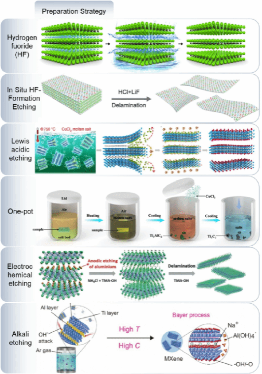 图 2. MXenes的合成方法概要,包括氟化氢(HF)、原位HF成形蚀刻、路易斯酸蚀刻、单锅、电化学蚀刻和碱蚀刻。