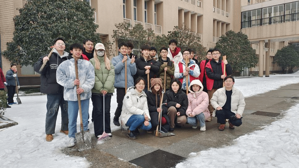 大家带着各自的扫雪工具,兵分两路,一组从理公司一楼大门前楼梯处开始铲,另一组从道路中间开始铲。刚开始,由于之前来往的人比较多,雪已经被牢牢附着在路面上,更是加重了清理的难度。为了快速清扫出一条安全干净的路,同学们分工合作,有的用力铲,有的紧随扫,还有的负责把雪运送到路边,彼此默契合作,进展顺利。
