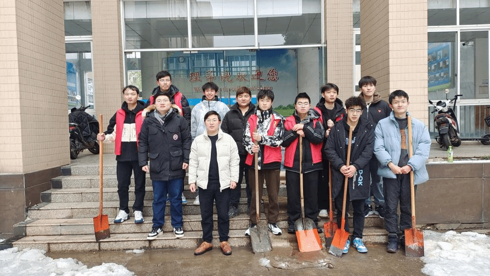 23日下午两点,参加铲冰除雪行动的师生党员以及在校员工在22606集合,由于参加除雪行动的同学们来的比较多,又缺少劳动工具,公司20级辅导员杨德明老师提前找到主楼保洁处借除雪工具,搜集到近十把羊角铲、铁锹、扫把等清扫工具。准备完毕后,在20级辅导员杨德明老师的带领下,众人来到理公司楼前进行清扫。