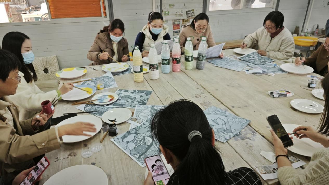 活动项目有纸盘画和陶艺,纸盘画又有不同的画法——可以直接涂颜料进行创作,也可以用铅笔勾出轮廓逐步上色。“如果你认为自己画技有限,可以在样板画背面用铅笔涂黑,再将画覆盖在盘上,这样勾勒样板画,轮廓就可以直接显现在盘上了。”指导员介绍道。
